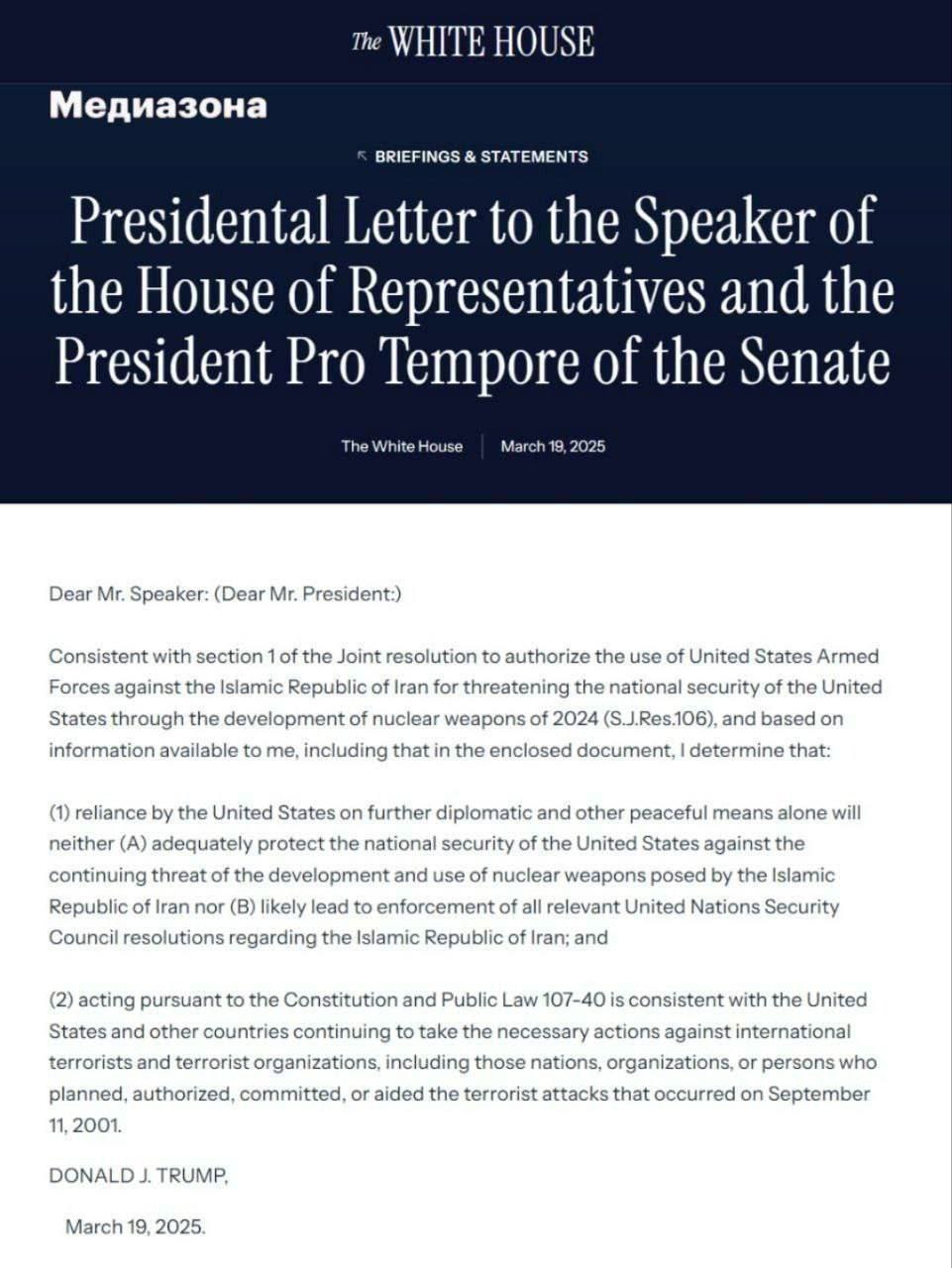عکسی هم در حال انتشار است که گفته میشود متن نامه ترامپ خطاب به سران کنگره در همین راستا است.