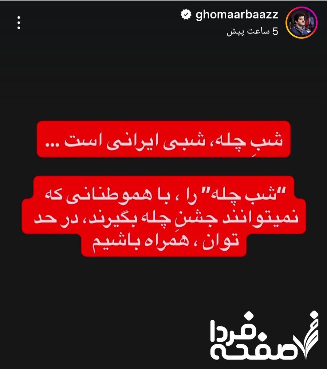 شب چله، شبی ایرانی است. شب چله را با هموطنانی که نمیتوانند جشن چله بگیرند، در حد توان همراه باشیم