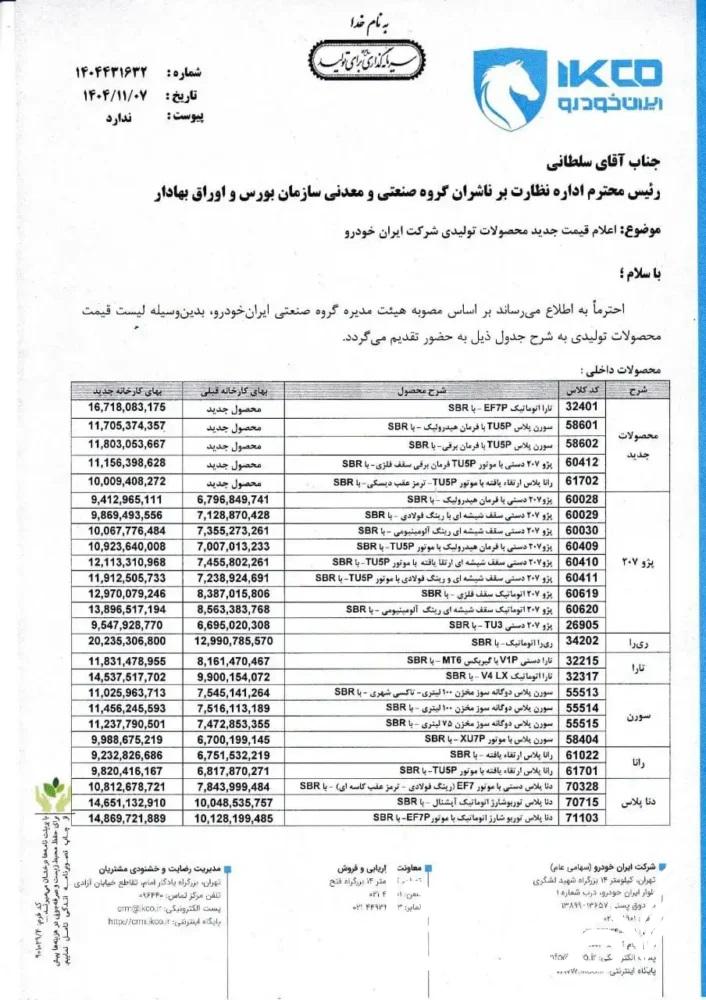 شرکت ایران خودرو قیمت کارخانه محصولات خود را ویژه بهمن ماه ۱۴۰۴ اعلام کرد. ایران خودرو قیمت کارخانه ای تمامی گروه محصولات خود را افزایش داده است. قیمت جدید خام کارخانه ای محصولات ایران خودرو در بهمن ماه نسبت به دی ۱۴۰۴ افزایش ۲۰ تا ۴۵ درصدی را تجربه کرده که یکی از شدید ترین افزایش قیمت های این شرکت در سال های گذشته بوده است. افزایش قیمت ها به صورت نهایی نبوده و تنها قیمت خام خودرو است. قیمت نهایی محصولات ایران خودرو به زودی اعلام می شود که با احتساب هزینه های جانبی شامل پلاک گذاری، عوارض و … است. پیش بینی می شود به قیمت های فوق تا ۱۹.۵ درصد هزینه های جانبی افزوده شود. در این بین محصولات ایران خودرو قیمت ری را در درب کارخانه به ۲,۰۲۳,۵۳۶,۰۸۰ تومان رسیده که افزایش حدودی ۸۰۰ میلیون تومانی را نسبت به دی ماه تجربه کرده است. قیمت پژو ۲۰۷ اتوماتیک با سقف شیشه ای و رینگ آلومینومی با افزایش بهاء حدودی ۵۰۰ میلیون تومانی به ۱,۳۸۹,۶۵۱,۷۱۹ تومان رسیده است. ایران خودرو در لیست قیمت جدید خود قیمت ۵ محصول جدید خود تارا اتوماتیک EFP، سورن پلاس TU5P با فرمان برقی و هیدرولیک، پژو ۲۰۷ با کد ۶۰۴۱۲, رانا پلاس ارتقاء یافته با موتور TU5P را نیز اعلام کرده است.