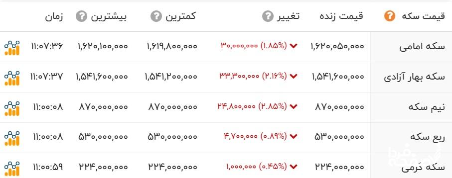 قیمت سکه بهار آزادی نیز با سه میلیون و ۳۰۰ هزارتومان کاهش به ۱۵۴ میلیون و ۴۱۶ هزارتومان رسید.