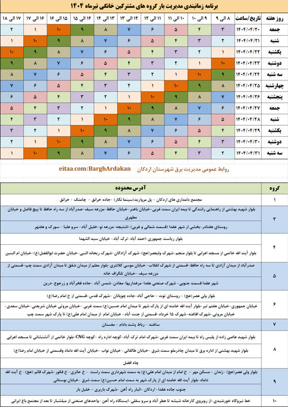 برنامه احتمالی زمانبندی مدیریت بار خانگی شهرستان مهریز با گروه بندی جدید برای جمعه ۲۰ تیرماه ۱۴۰۴