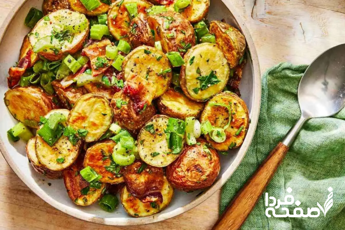 ـ برای درست کردن این سالاد بهتر است از سیب زمینیهای ریز استفاده کنید؛ زیرا راحتتر داخل فر میپزند و برشته میشوند.