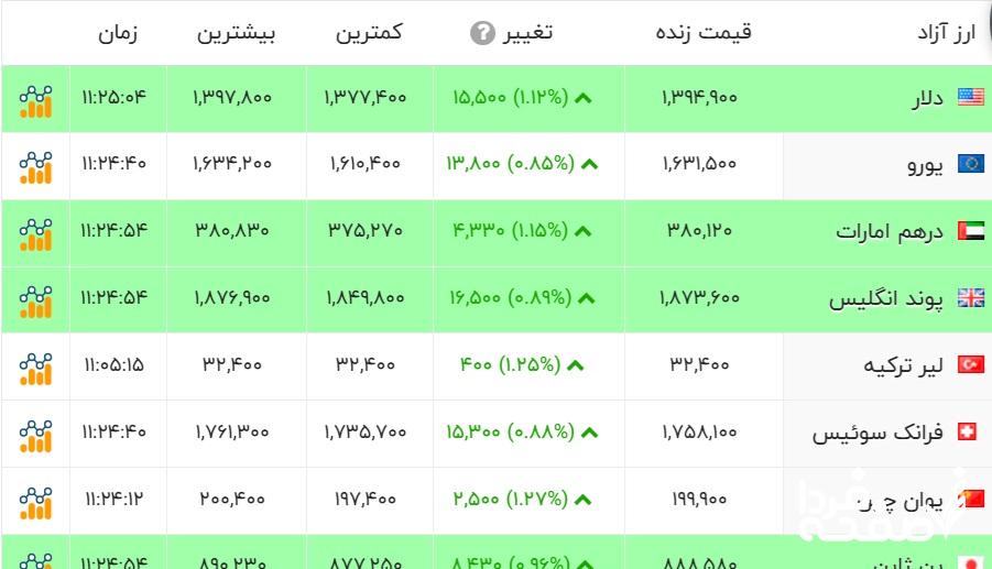 قیمت یورو نیز امروز با ۱۳۸۰ تومان افزایش به ۱۶۳ هزار و ۱۵۰ تومان رسید.
