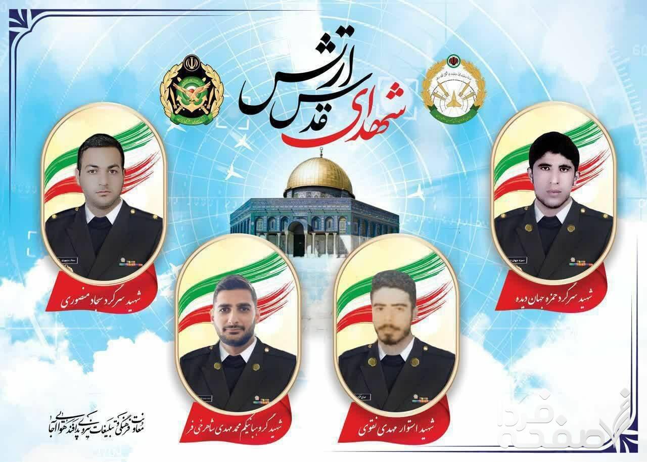 در بیانیه ارتش جمهوری اسلامی ایران سرگرد «حمزه جهان دیده»، استوار «محمدمهدی شاهرخی فر»، سرگرد «سجاد منصوری» و استوار «مهدی نقوی» بامداد شنبه حین مقابله با پرتابههای رژیم جنایتکار صهیونیستی به شهادت رسیدند.