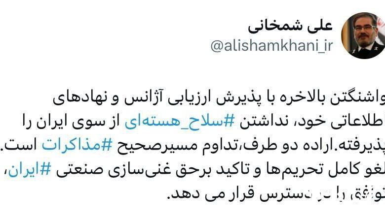 شمخانی نوشت: واشنگتن با پذیرش ارزیابی آژانس، نداشتن سلاح هسته‌ای از سوی ایران را پذیرفته است.