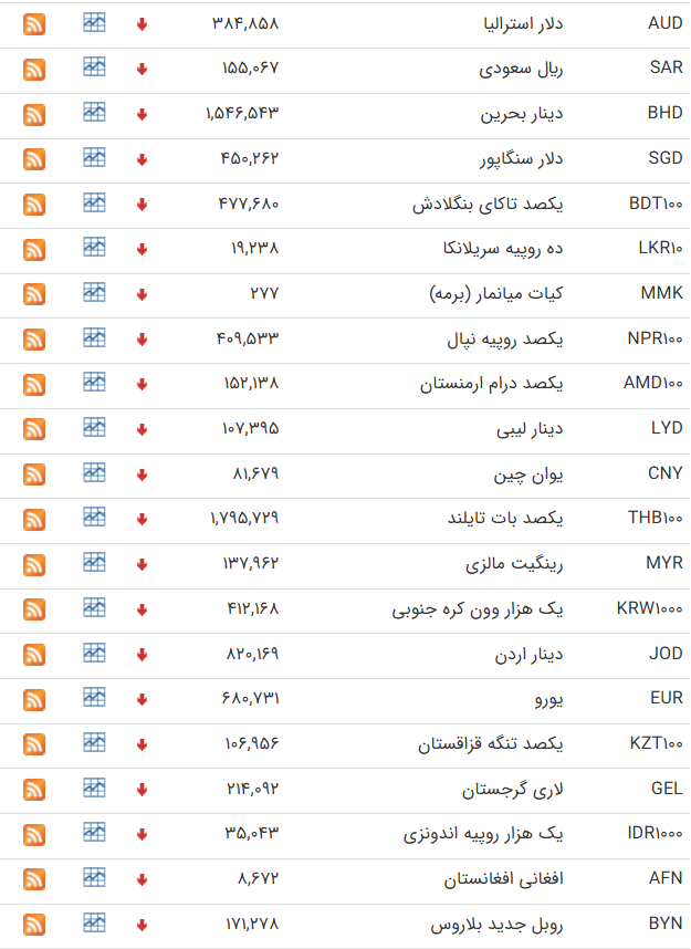 روبل روسیه | RUB | ۸,۶۳۰ | ۸,۷۰۸ | -۹۰ | ۸,۳۷۹ | ۸,۴۵۵ | -۸۷ |