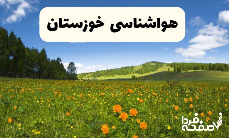 در شهرستان‌های اهواز، آبادان، آبادان، شوش، مسجدسلیمان، دزفول، ایذه، رامهرمز، هویزه، لالی، بستان، شوشتر، بندرماهشهر، اندیمشک، بهبهان، آغاجاری، شادگان، خرمشهر، ماهشهر، سوسنگرد، هندیجان، قلعه‌تل، رامشیر، بندر امام خمینی، امیدیه و همچنین شهرستان هاشم، وضعیت هوا آفتابی و گرم خواهد بود.