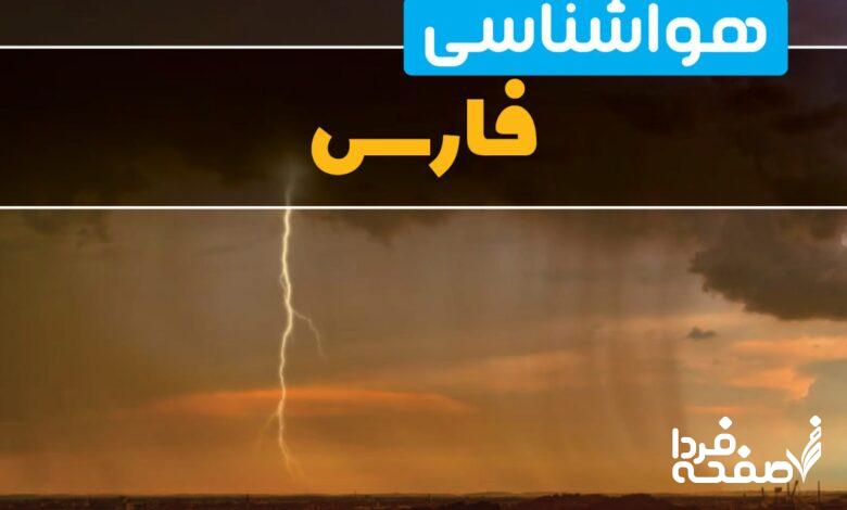 آسمان عمدتاً صاف و دما در این مناطق بهصورت پلکانی افزایش مییابد. احتمال وزش بادهای شرقی و گردوخاک محلی در داراب وجود دارد.