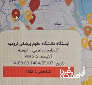 آخرین شاخص اعلامی از سوی سامانه پایش کیفی هوای کشور، وضعیت هوای ارومیه را در وضع بسیار ناسالم نشان میدهد و این شهر، آلودهترین شهر ایران لقب گرفت.