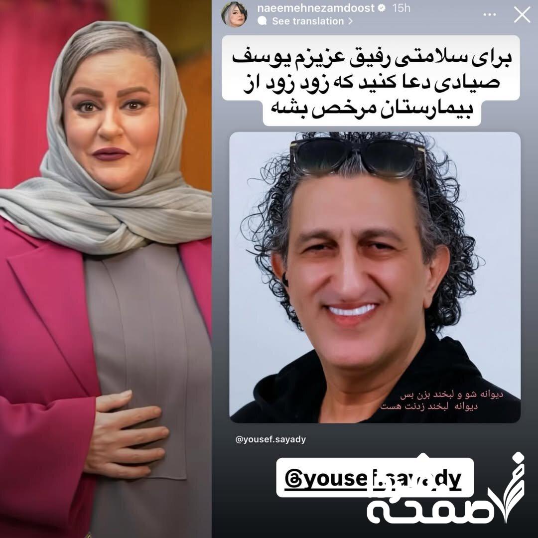 نعیمه نظامدوست بازیگر سینما در یک استوری نوشته بود: برای سلامتی رفیق عزیزم یوسف صیادی دعا کنید که زود زود از بیمارستان مرخص بشه.
